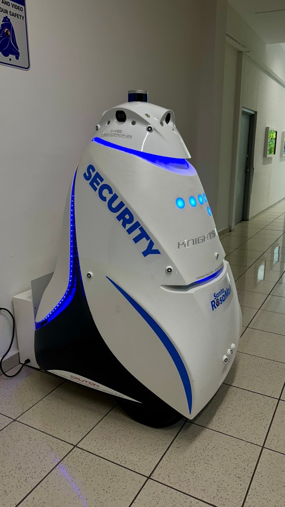 Sin embargo, lo que más me sorprendió no fue la falta de clientes o el exceso de espacios vacíos, sino la presencia de robots de seguridad de la firma Knightscope. Estas máquinas patrullan los pasillos con sus sofisticadas cámaras de vigilancia, reemplazando la labor de los guardias de seguridad humanos. En un lugar donde la crisis ha provocado el cierre de múltiples negocios y la pérdida de empleos, resulta paradójico que la administración del mall prefiera invertir en tecnología de automatización en lugar de generar oportunidades laborales para los trabajadores locales.
